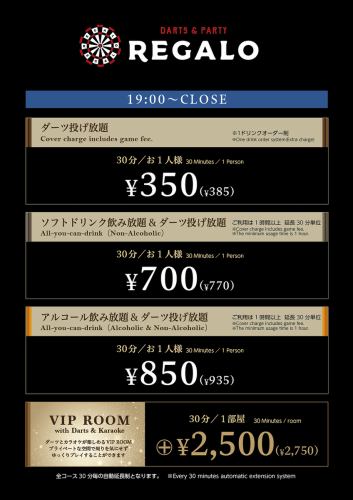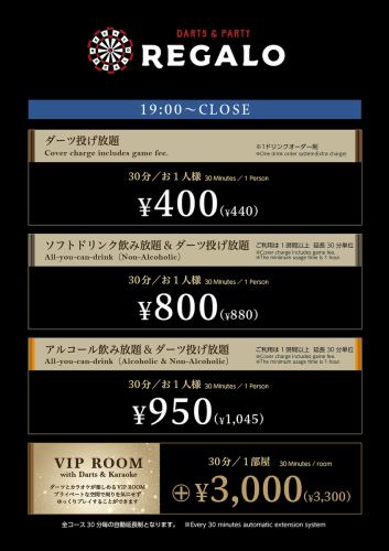 飲みながらにぎやかに楽しくダーツが楽しめる完全個室のVIPルームをご用意しております!最大14名様までご利用が可能です。合コン、女子会で盛り上がること間違いなし!ぜひ秋葉原のダーツバーREGALO 秋葉原駅前店のご利用をお待ちしております。